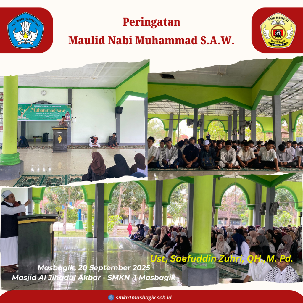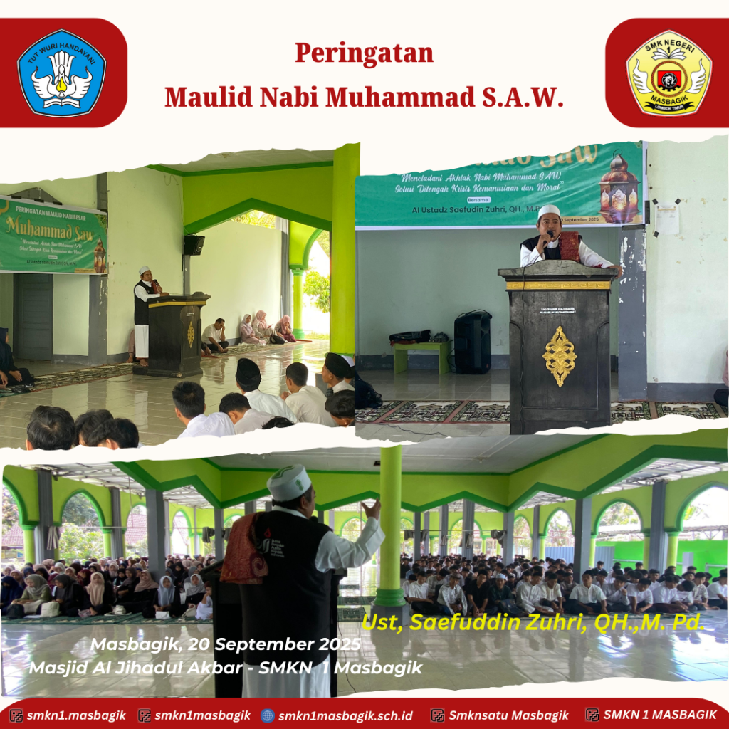 Pada hari Sabtu, 20 September 2025, SMKN 1 Masbagik menggelar peringatan Maulid Nabi Muhammad SAW sebagai bentuk kecintaan dan penghormatan terhadap Rasulullah, suri teladan umat sepanjang zaman. Kegiatan ini menghadirkan Ust. Saefuddin Zuhri, QH., M.Pd sebagai penceramah, dengan mengangkat tema “Meneladani Akhlak Nabi Muhammad SAW, Solusi di Tengah Krisis Kemanusiaan dan Moral.”