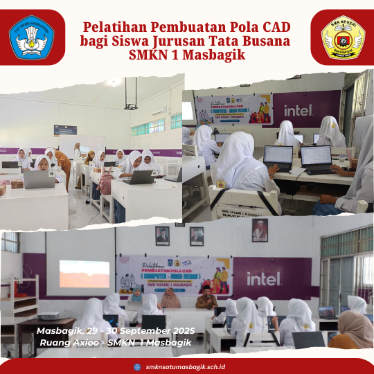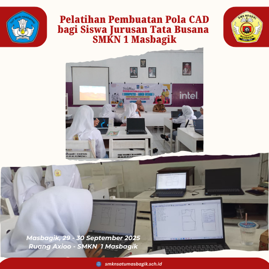 Kegiatan Pelatihan Pembuatan Pola CAD dilaksanakan di SMKN 1 Masbagik, dengan sasaran siswa kelas XI Desain dan Produksi Busana, kegiatan ini bertujuan untuk mempersiapkan siswa dalam mengikuti kegiatan LKS, baik tingkat Provinsi dan Nasional dan menambah wawasan ilmu dalam bidangnya.