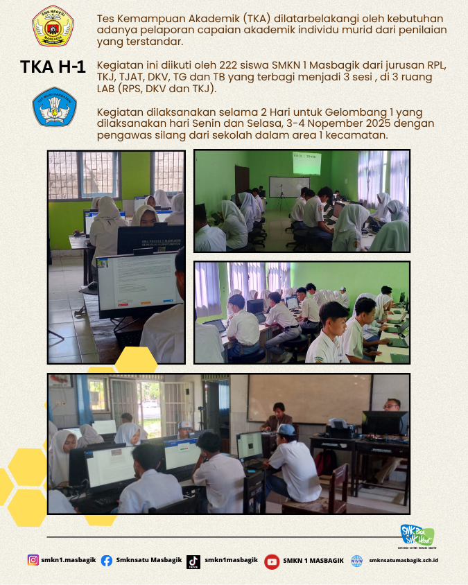 Pelaksanaan TKA di SMKN 1 Masbagik terjadwal pada gelombang 1 dimana pada hari Senin, 3 Nopember 2025 siswa mengerjakan 3 mata ujian yaitu Bahasa Indonesia, Matematika dan Bahasa Inggris.