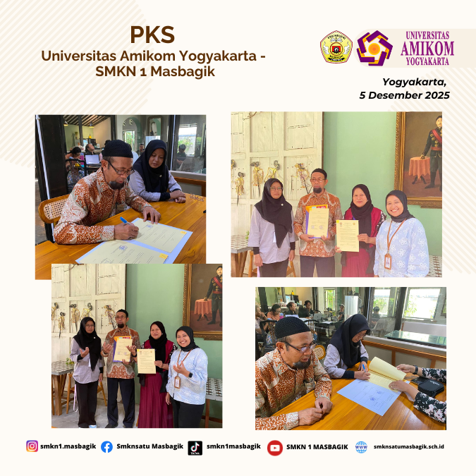 Pada hari Jumat, 5 Desember 2025, SMKN 1 Masbagik resmi menjalin kerjasama strategis dengan Universitas Amikom Yogyakarta. Kegiatan penandatanganan PKS ini dilaksanakan di Huis Of Java, Yogyakarta, dalam suasana penuh kehangatan dan semangat kolaborasi.
