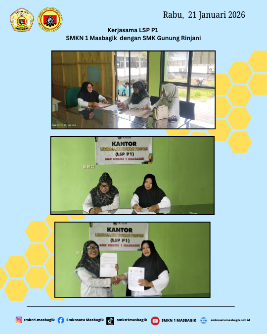 Alhamdulillah Penandatanganan Perjanjian Kerja Sama (PKS) jejaring Lembaga Sertifikasi Profesi (LSP) – P1 SMKN 1 Masbagik dengan SMK Gunung Rinjani telah ditandatangani oleh Ibu Mariana Hidayanti, ST., M.Kom selaku Direktur LSP-P1 SMKN 1 Masbagik dengan Syariyah, S.Pd. selaku Kepala Sekolah SMK Gunung Rinjani Lombok Timur, kerjasama ini bertujuan untuk memperkuat implementasi Program SMK Pusat Keunggulan (SMK PK) melalui penyelarasan sistem pembelajaran, penilaian, dan sertifikasi kompetensi yang berbasis kebutuhan Dunia Usaha dan Dunia Industri (DUDI).