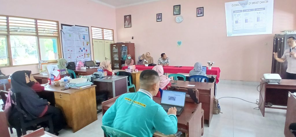 Kegiatan edukasi kesehatan bertema deteksi dini kanker payudara diselenggarakan di ruang guru SMKN 1 Masbagik pada Sabtu, 14 Februari 2026, dan diikuti oleh seluruh guru serta tenaga kependidikan. Materi disampaikan oleh Dr. M. Tontowi Jauhari, seorang dokter spesialis bedah konsultan onkologi, didampingi oleh Tim dari Puskemas Baru Masbagik yang diwakili oleh Dokter Rangga, Bidan Rini Afriyanti beserta staf, yang memberikan pemahaman komprehensif mengenai pentingnya mengenali tanda awal kanker payudara, langkah pencegahan, serta prosedur penanganan medis yang tepat.