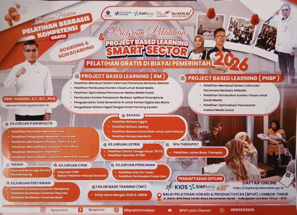 Hai para alumni SMK khususnya Alumni SMKN 1 Masbagik, Balai Pelatihan Vokasi dan Produktivitas (BPVP) Lombok Timur.Brosur ini menawarkan Program Pelatihan Berbasis Kompetensi (PBK) dan Project Based Learning Smart Sector Tahun 2026. Program ini memberikan kesempatan bagi lulusan SMK untuk meningkatkan keterampilan kerja melalui pelatihan praktis di berbagai bidang seperti pariwisata, listrik, pertanian, perikanan, bahasa, spa therapist, hingga pelatihan digital seperti pembuatan konten visual, sistem informasi berbasis web, dan pemanfaatan AI untuk konten digital. Program ini gratis dengan pembiayaan dari pemerintah serta menyediakan pilihan boarding maupun non-boarding, sehingga peserta dapat belajar secara intensif dengan fasilitas yang mendukung. Dengan pendekatan Project Based Learning, peserta tidak hanya belajar teori tetapi juga langsung membuat proyek nyata yang relevan dengan dunia kerja dan industri.